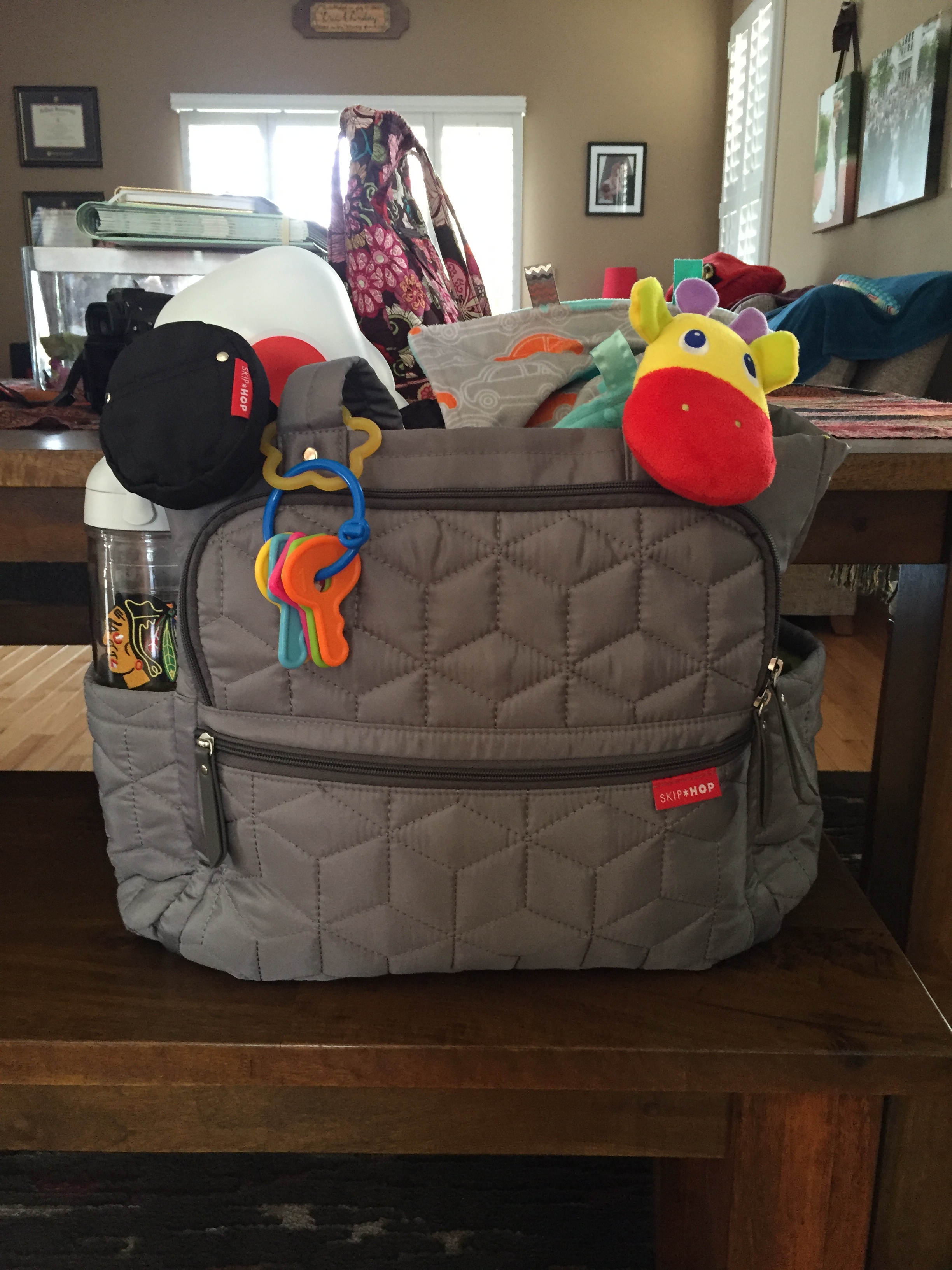 NOTE: My Skip Hop diaper bag was a wonderful gift from my Drakert family. We selected this bag sold exclusively from Babies R Us because I loved the grey and it came with two packing cubes to hold extra outfits.
