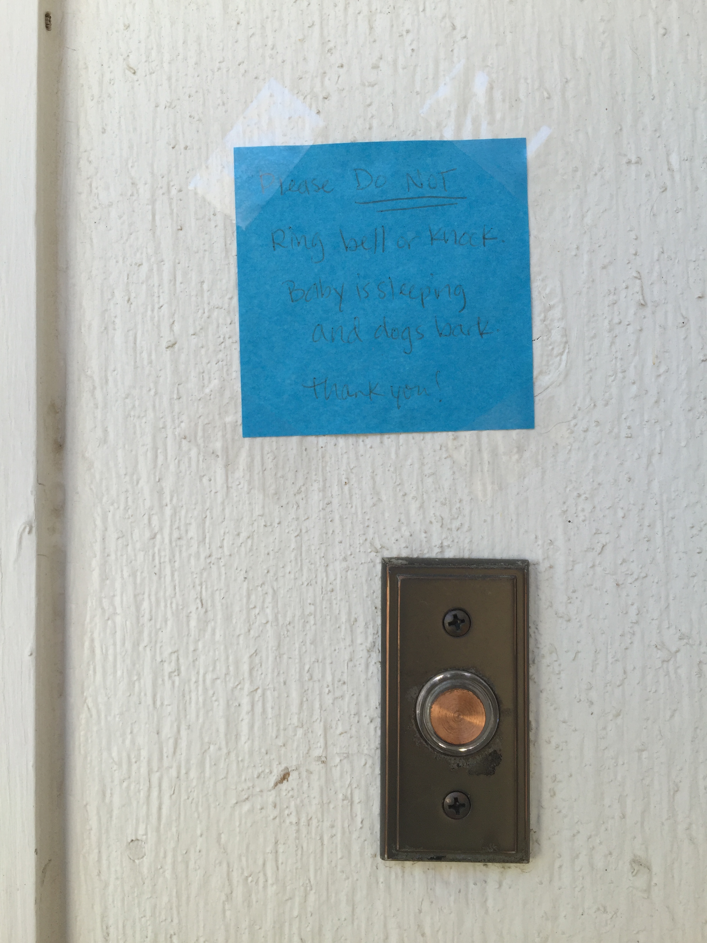 I came up with the simplest of fixes: a post-it note taped above the doorbell asking visitors to refrain from pressing it. The note first said, “Please do not ring bell. Dogs bark and baby is asleep.” But I had to make an update after a woman soliciting her housecleaning services knocked on the door, making the dogs bark and the baby wake up. She pointed out the note did not say knocking was prohibited. image