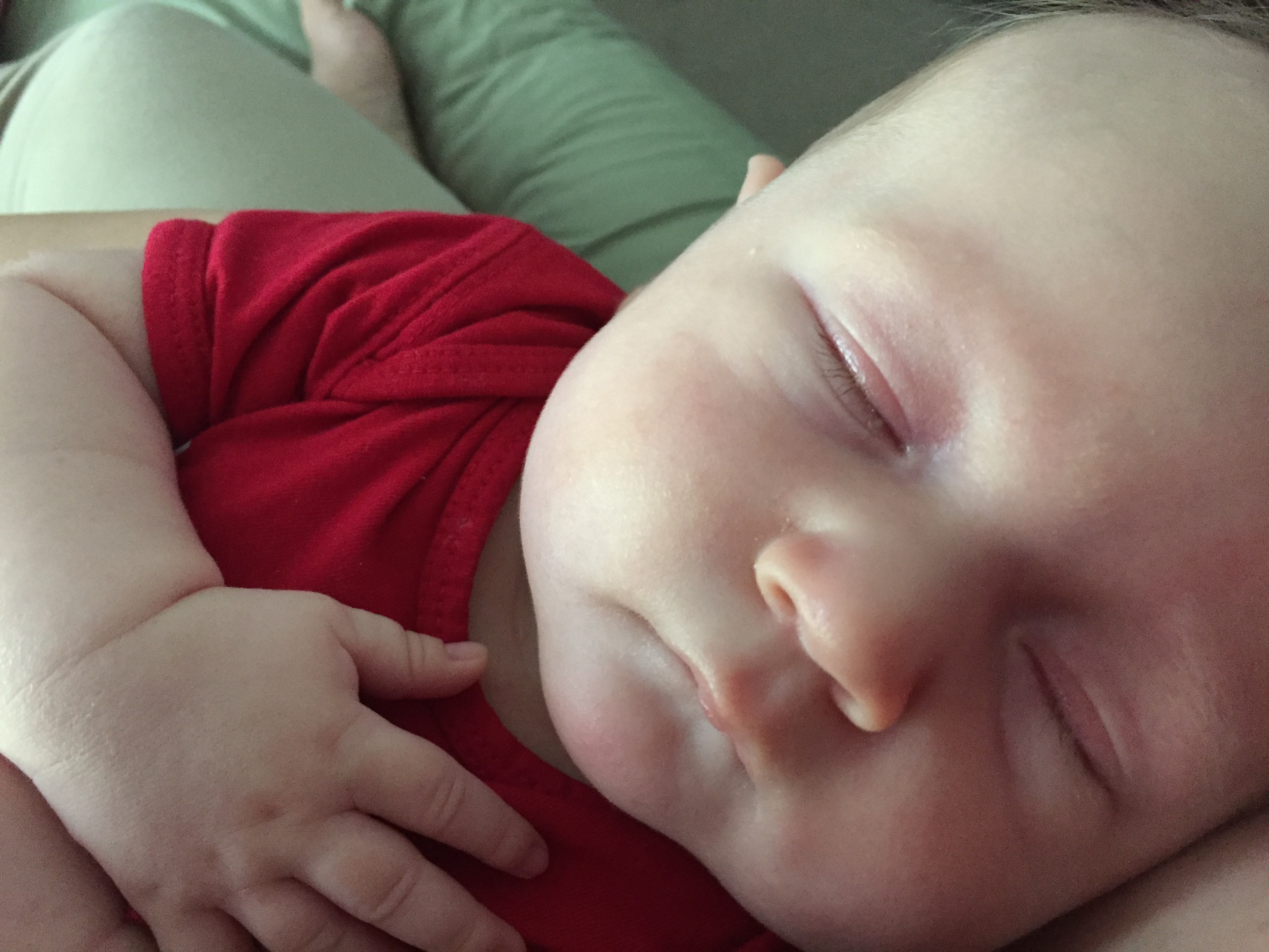 Little Leigh had his 2-month vaccines this week. The nurse gave him two shots and an oral vaccination. He screamed so loudly! I always thought injections were worse because you think about a needle going through your skin. Well, Leigh didn’t know what was going on and he still screamed, so I know it was painful for him. I nursed him right afterwards to calm him down, but I still felt horrible when I saw those big alligator tears rolling down his face. On top of everything, his eyes are infected, making him look even sadder. He’s got green goop pooling in the corners of his eyes. We apply an ointment that makes it look like he’s been crying for hours.