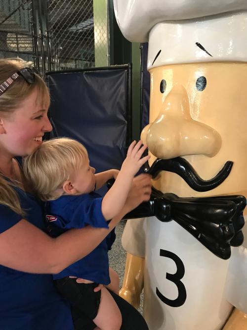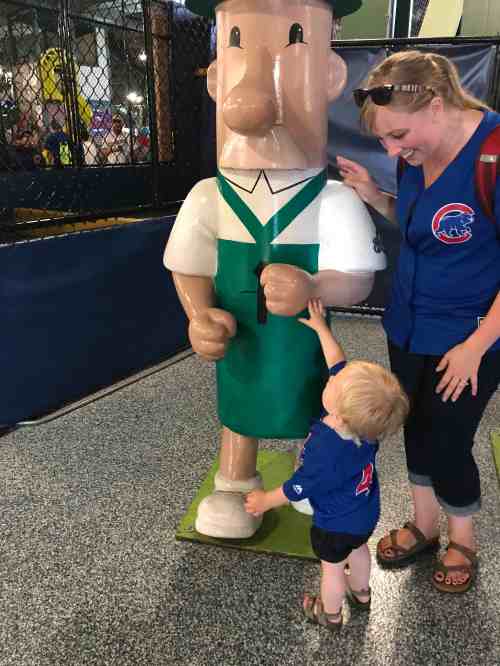 We walked down the first base line and visited the super kid-friendly area called Bernie’s Clubhouse. They had aspot where you could race to first base, hit baseballs, and throw out a pitch. All very interactive and beyond Leigh’s capabilities, but we’ll come back to play when turns 5 or 6 so he can enjoy everything. For now, he really enjoyed meeting all the famous racing sausages.