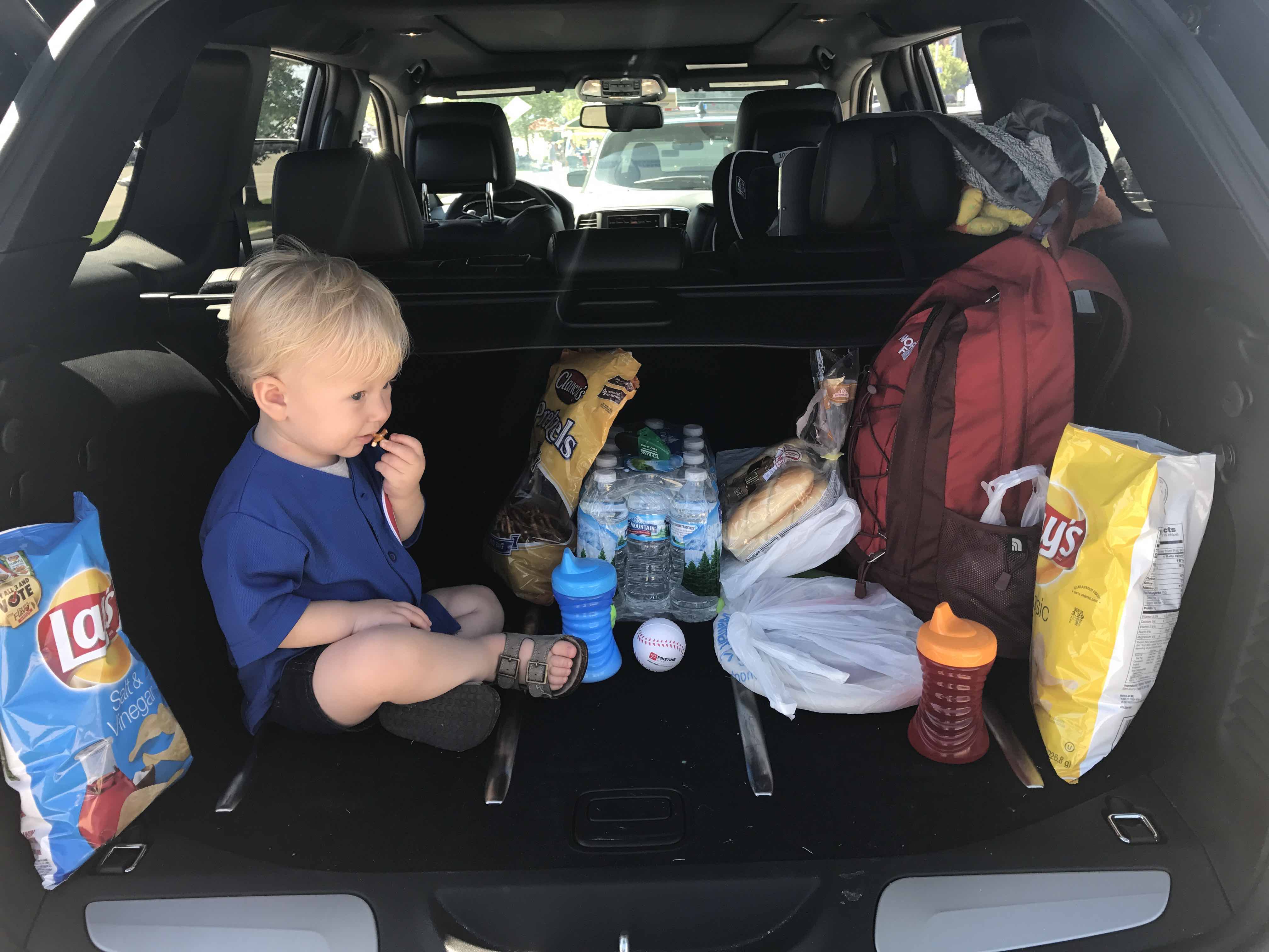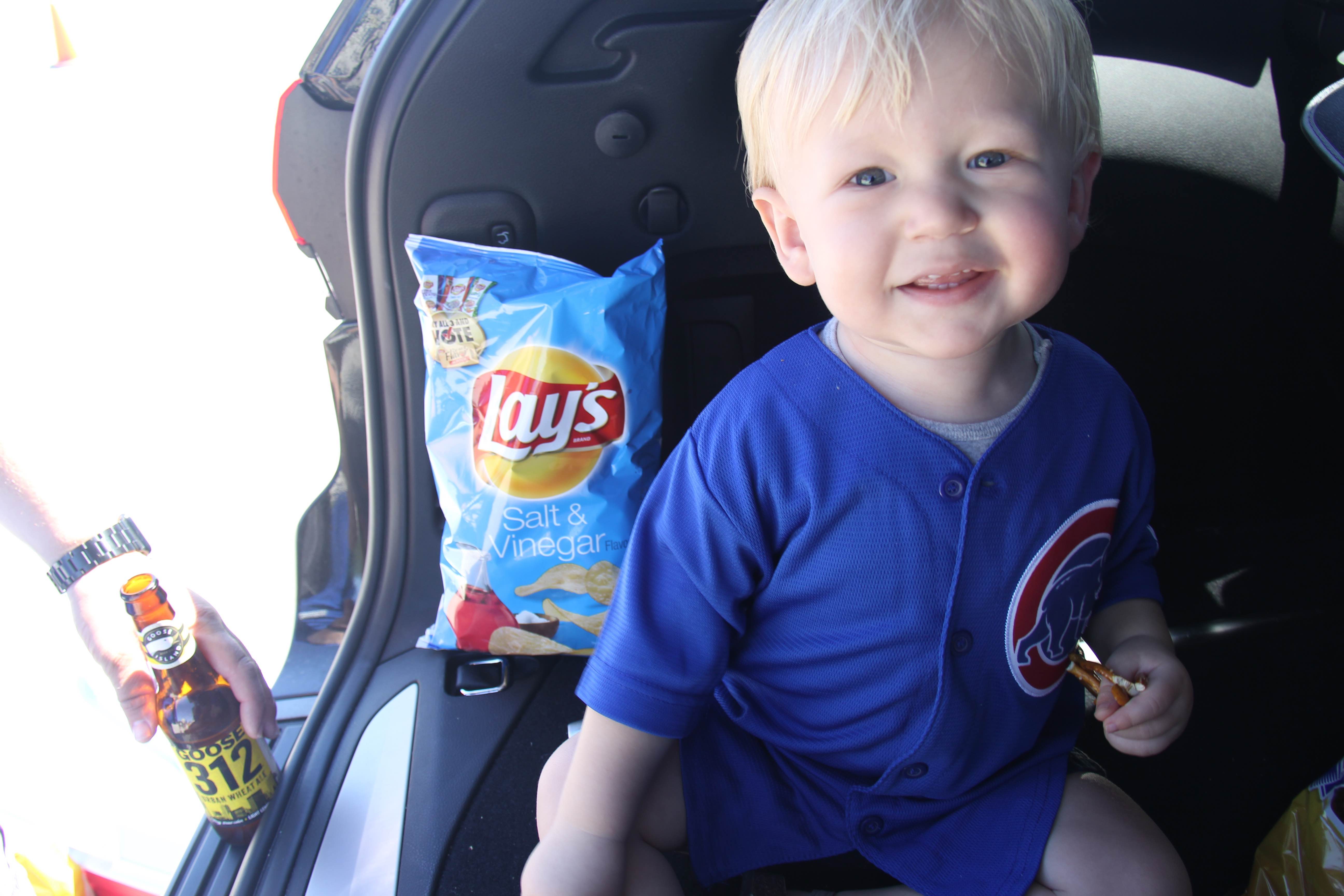 We set up a little Weber Q Grill – quick and easy to char up our Lake Geneva Country Meats brats. Eric made a little pan of beer steamed onions to top our brats off. We ate potato and pasta salads with chips out of the bag. Leigh hung out in the back of the Jeep, dancing to the music around him. Tailgating isn’t super kid-friendly, but only because there are hot grills and moving vehicles all over the place. The people are so super friendly, it wasn’t hard to walk him around and let him soak up the extra attention. Smiles all around.