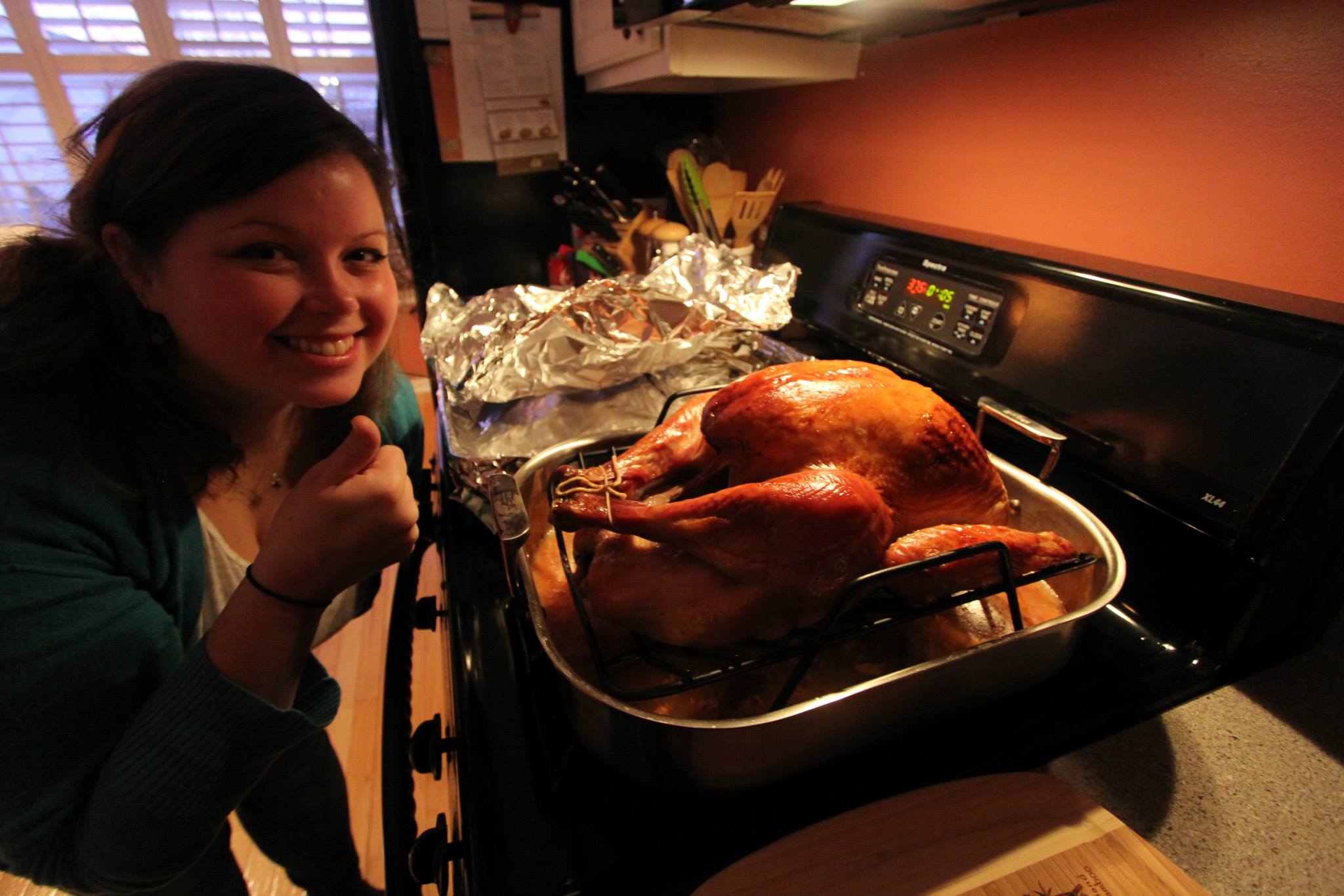 These days, we roast our turkey in a beautiful, stainless steel All-Clad roasting pan. We use it specifically to make big turkeys and holiday roasts. It sits in its box at the top of the pantry most of the year, so when we take it out, we mean business. The turkey sits in the nonstick roasting rack that comes with the pan so we can get all the mouthwatering juices that come out during the roasting process. We used to bake our bird in a disposable aluminum pan and it always worked out just fine, but it might take longer to cook because the heat doesn’t stay in the aluminum the way it retains in the steel. If you’re serious about roasting turkeys, get a good roasting pan. It’s worth the investment.