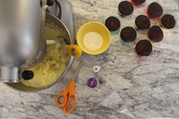 I made my homemade frosting in my Kitchen Aid stand mixer. The beater whips the frosting up in a few minutes. I put a couple sticks of room temperature butter in the bowl, whip it, add a couple cups of powdered sugar, whip it, pour a teaspoon of vanilla extract in, whip it, and splash a little heavy whipping cream in, whip it good.