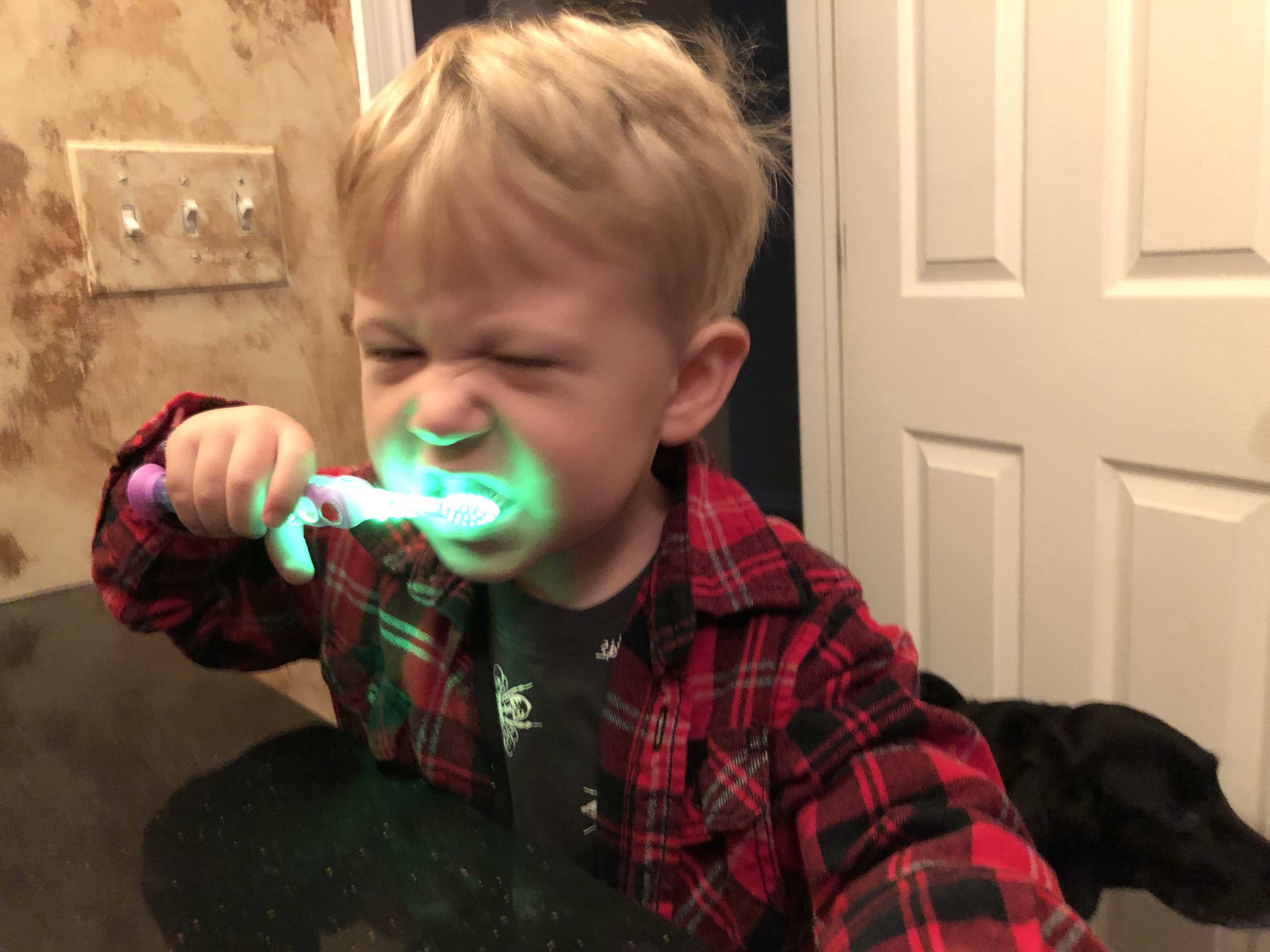 I did what every worried parent does: I Googled “How to make your toddler brush their teeth.” The first suggestion is to let them pick their own supplies. Well, yeah. I guess that might work instead of the stiff freebie the dentist gave us. We wandered over to the dental care aisle at the grocery store and Leigh was excited to pick a toothbrush. He grabbed all his favorite characters and threw them in the cart before we knew it. We helped him narrow it down to an attractive Firefly light up toothbrush and the kid-classic Sparkle Fun toothpaste. This toothbrush, who’s motto is “Good. Clean. Fun.” has red, yellow and green lights that automatically flash for the recommended brushing duration. It encourages Leigh to brush for two minutes without tacking on extra screentime. Miraculous! The best part is, the batteries last the life of the toothbrush so when they die, it’s time to get a new one. I don’t know about you, but I’m super guilty of using the same toothbrush head until the bristles start to wear off.