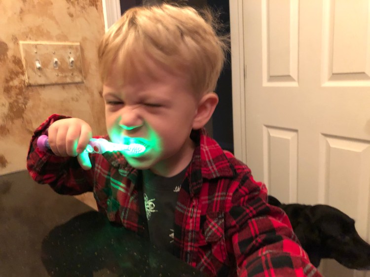 That night, I stood in front of the sink with Leigh expecting another fight, but instead, he grabbed the brush, pressed the start button and went to town. I helped him reach the back teeth (and refresh the fronts, too). After he was done, he proudly yelled, “YAY!” Turns out this magical toothbrush reportedly “doesn’t tickle.” Hey, I’ll take it.