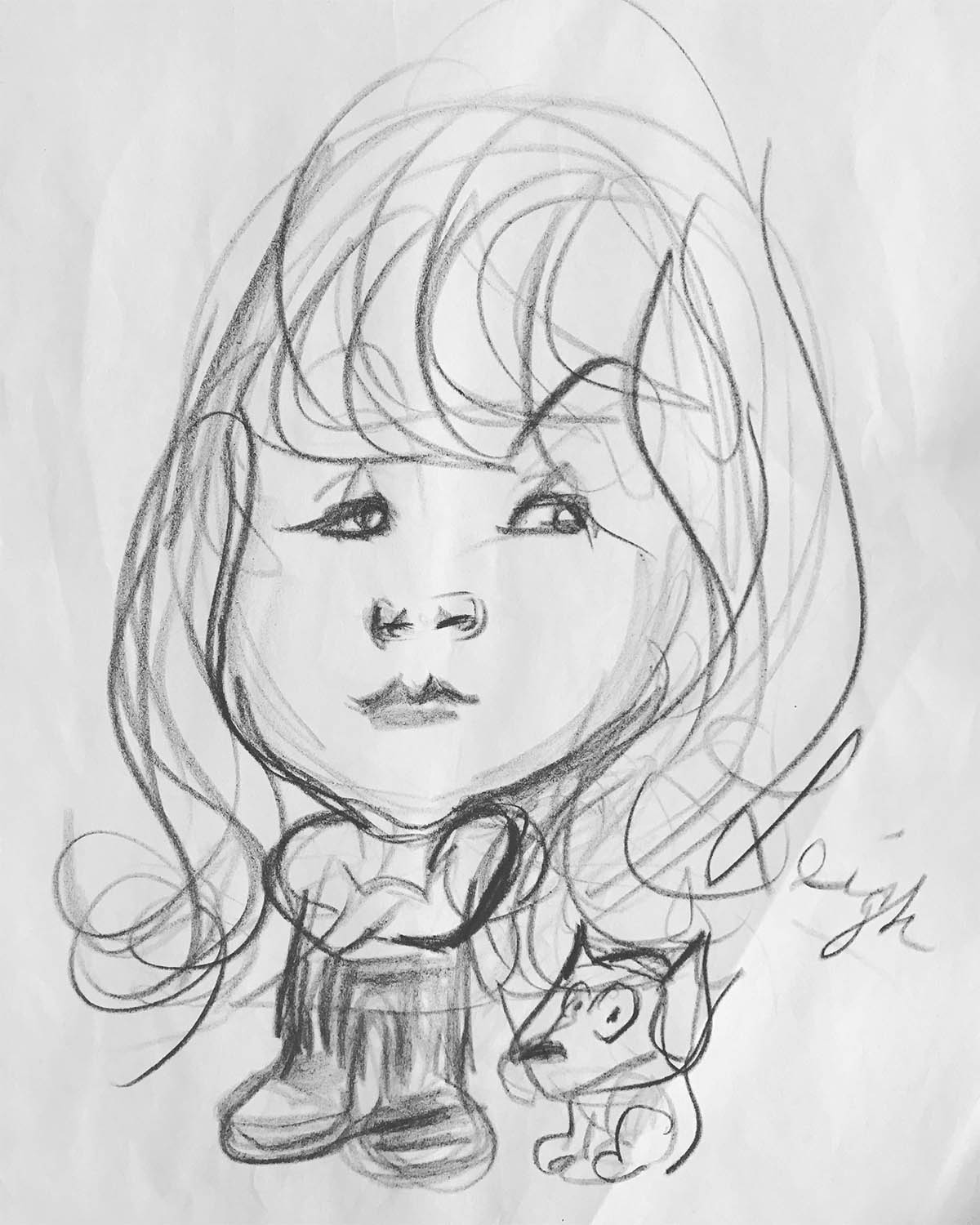 The man quickly drew pants on the illustration, added a dog, crossed arms and a single raised eyebrow. I guess that’s how boys are supposed to behave. We paid him $5 for the drawing and brought it home. We love his long hair. And we don’t care what anyone else thinks.