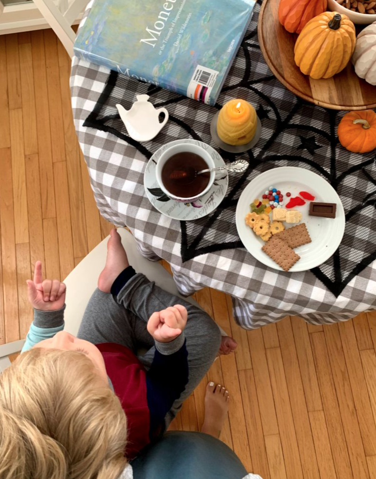 We instituted daily tea time out of necessity. While working from home with a preschool-aged child, spending four hours in the morning without stopping for a breath is tough on all of us. We needed something to help hold him over until lunch break. I read about homeschool moms doing weekly poetry tea time and thought that might work for us. They set out a special table cloth, break out fine China and fill a beautiful dish with sweets.