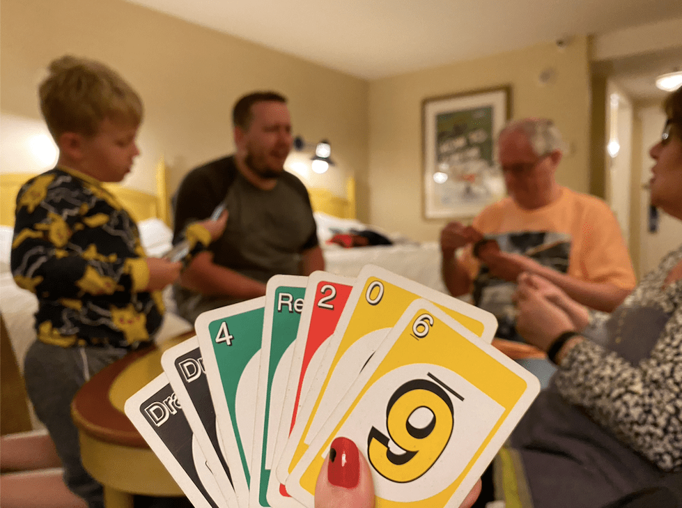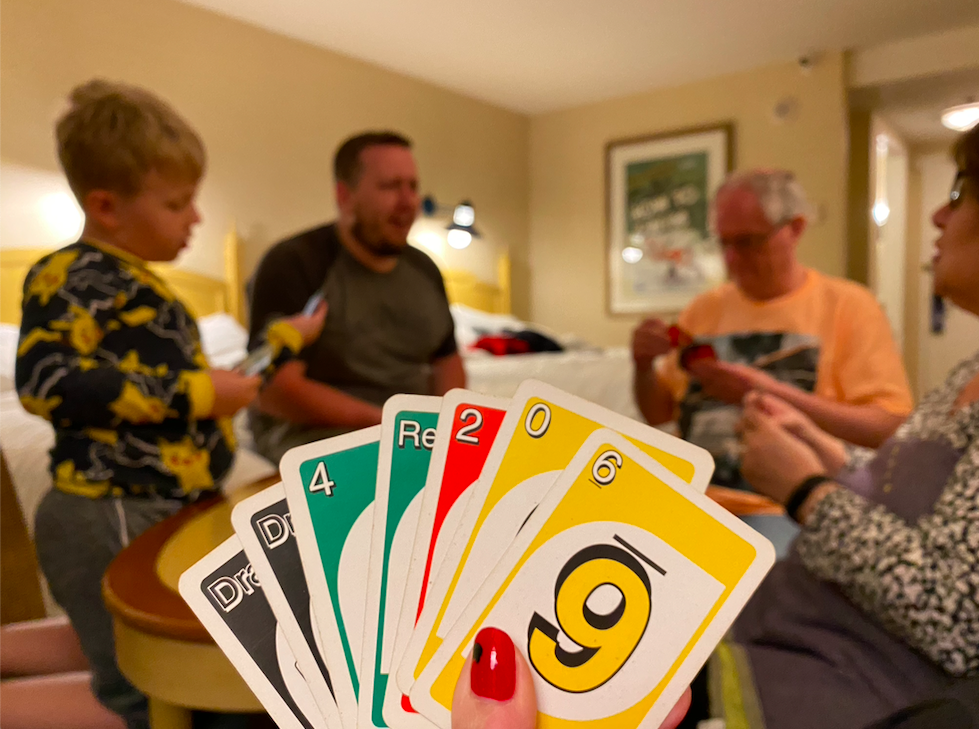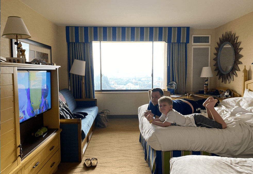 We stayed in adjoining rooms at the Disneyland Resort Paradise Pier Hotel. This made it easy to get ready in our own bathrooms and extra space for Leigh to jump around between beds. One memory I’ll never forget is playing “just one more” game of Uno together at night.