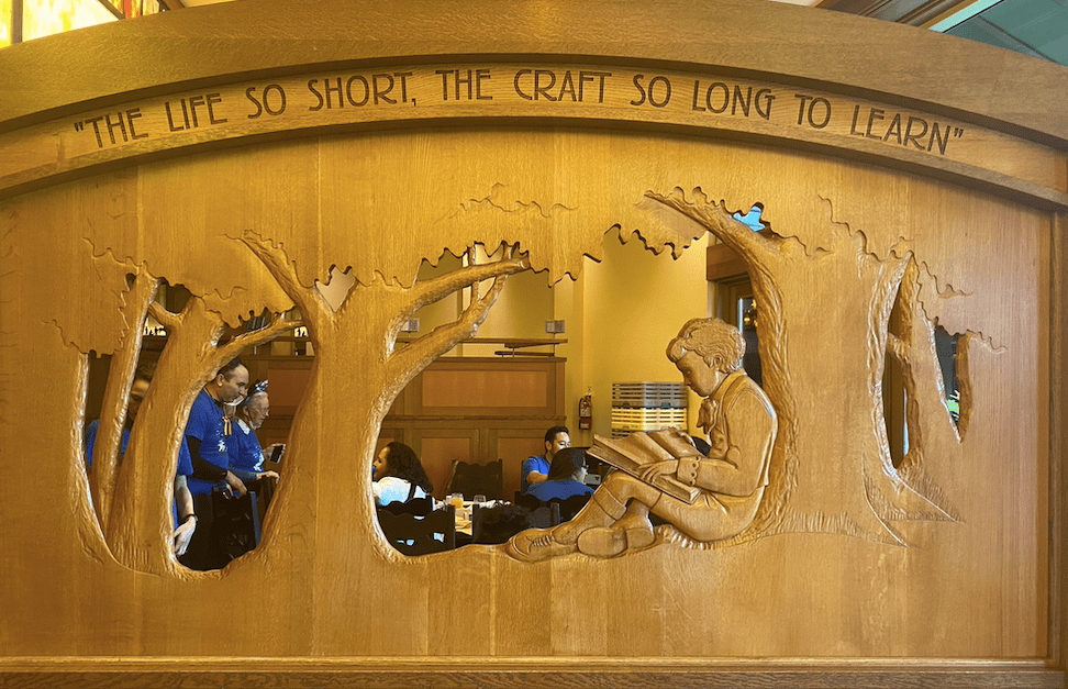 Another meal was breakfast inside the park at the beautifully historic Plaza Inn with Minnie and her friends. I loved learning designer Lillian Disney, Walt’s wife, handpicked many of the restaurant’s authentic 19th-century interior furnishings. It has a Victorian stained-glass ceiling, marble foyer and ornate gingerbread woodwork and drapery. This character experience was more subdued and Leigh was much more excited to wave to Minnie, Daisy, Chip and Dale as they pranced by every 20 minutes. Plus, it was easy to walk around to the rides after eating since we were already in the park!