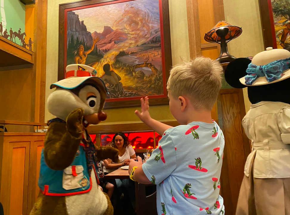 In order to spend time with Disney characters, we reserved all the character meals we could two months before our visit. Due to pandemic precautions, you’re not able to get up close and personal with characters. The days of autograph books are not back yet. You can still spot them throughout the park, waving at a distance, but these meals made it much easier to interact with them. Much to Leigh’s delight, Minnie Mouse played rock, paper, scissors with him!