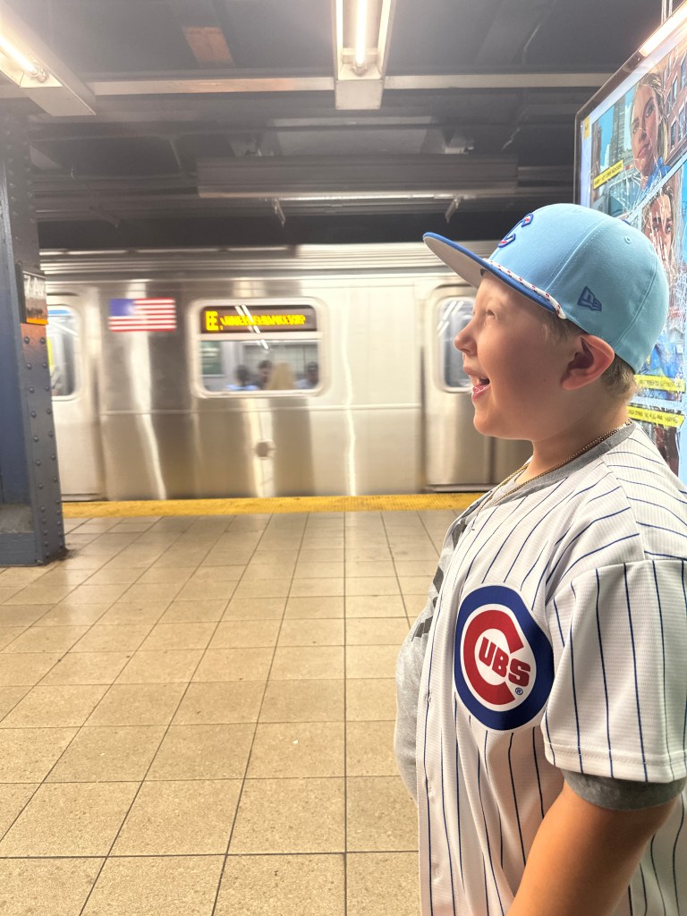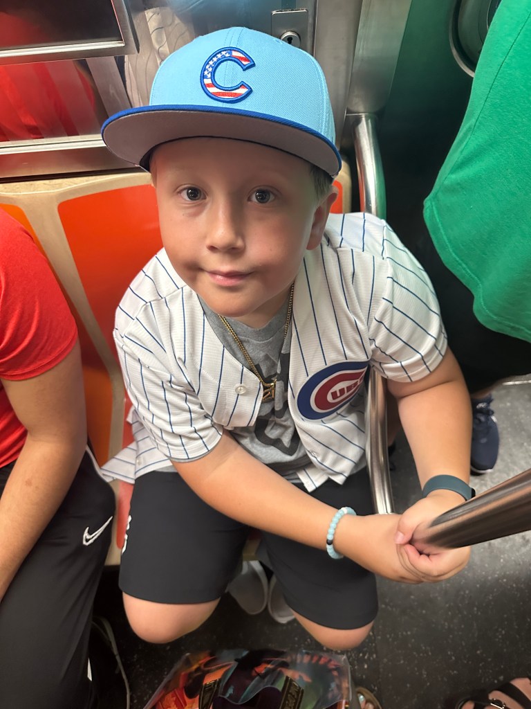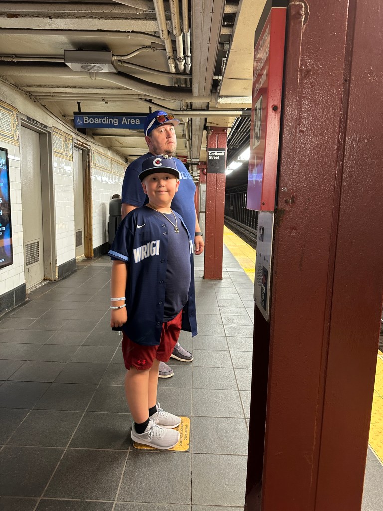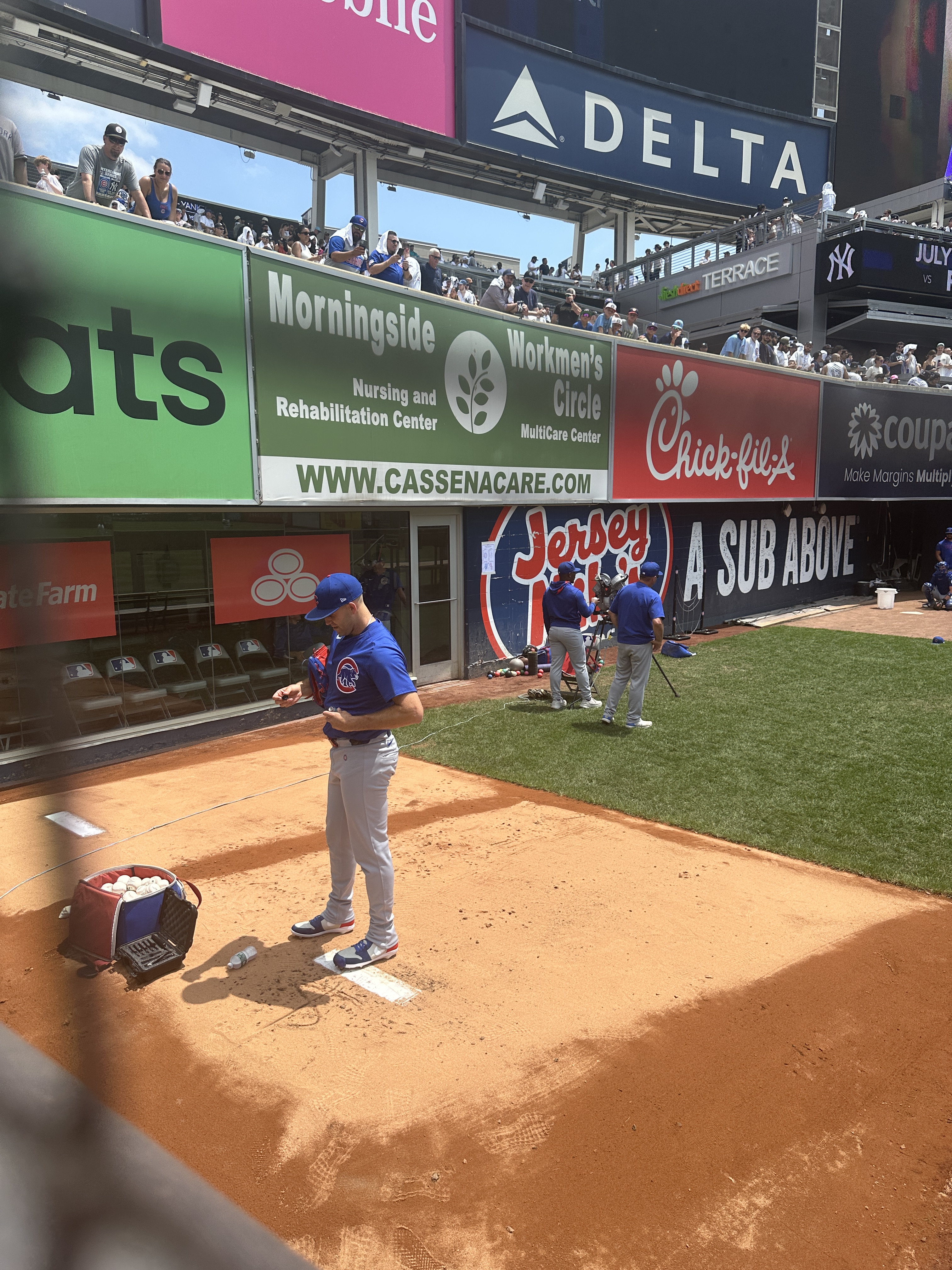 Let me tell you: no matter where we go, wearing a Cubs hat is like a friendly confines sign to passersby who yell, “Go Cubs!” and offer a thumbs up or high five. Cubs fans are everywhere. We found our seats in the outfield surrounded by a sea of Cubs fans with a few Yankees fans sprinkled among them. There was a happy young man who kept chanting to our favorite left fielder, “I love you, Ian!” Our seats were cushioned but toasty hot in the sun. Luckily, we had access to the Pepsi Lounge where we could spend $60 on three drinks in air conditioning – worth it! Out in the heat, our seats were right next to the visitors’ bullpen where our team warmed up the pitchers. Our All-Star pitcher Boyd held off the Yankees for eight innings with no runs. In the end, our relief pitchers allowed a few runs, but the Cubs beat the Yankees 5-2. And they went on to win the series 2-1.