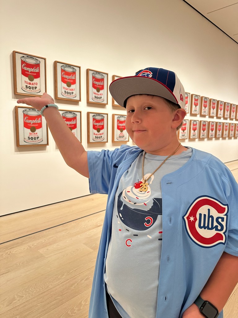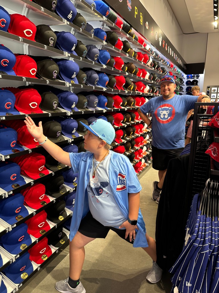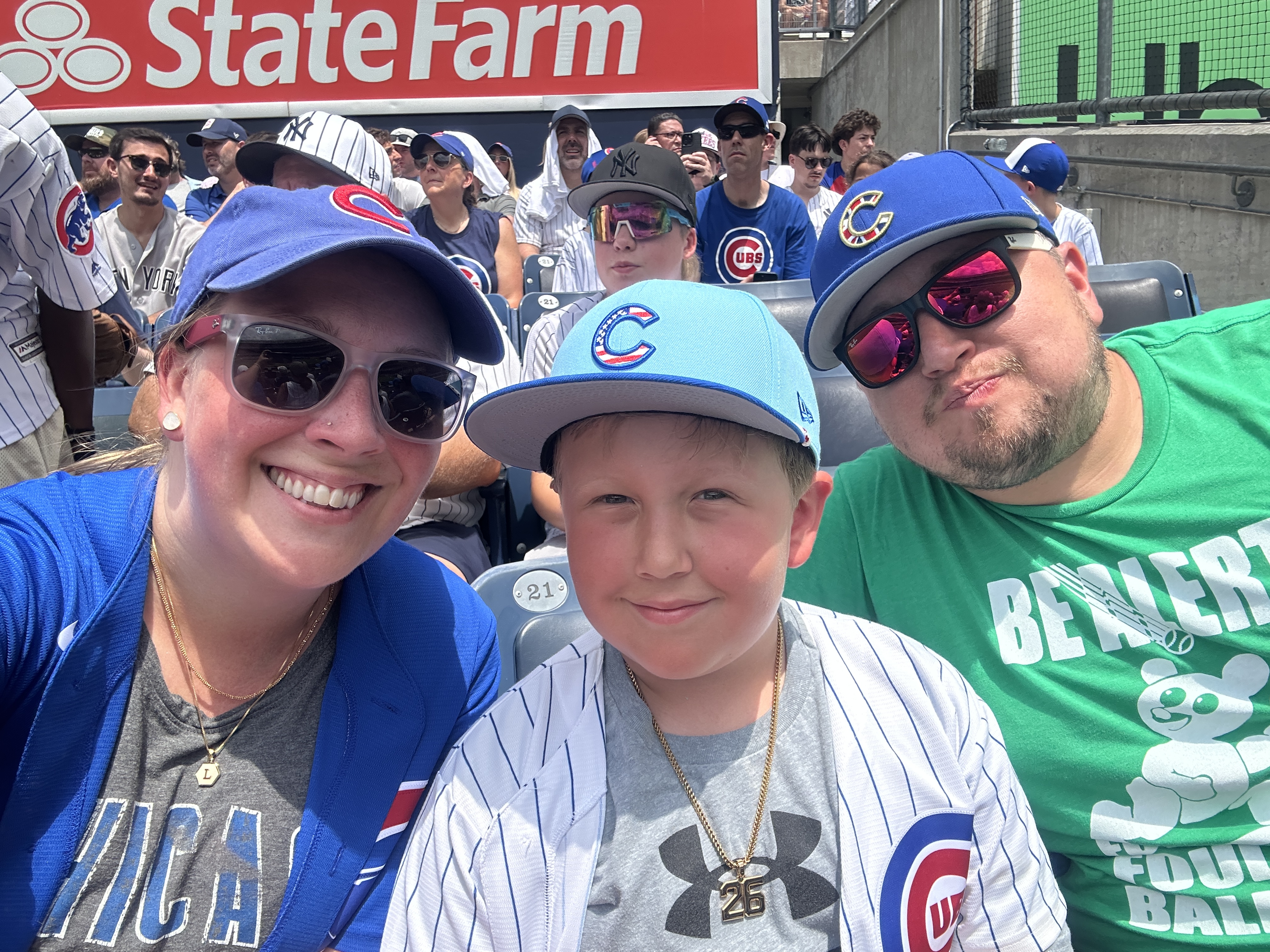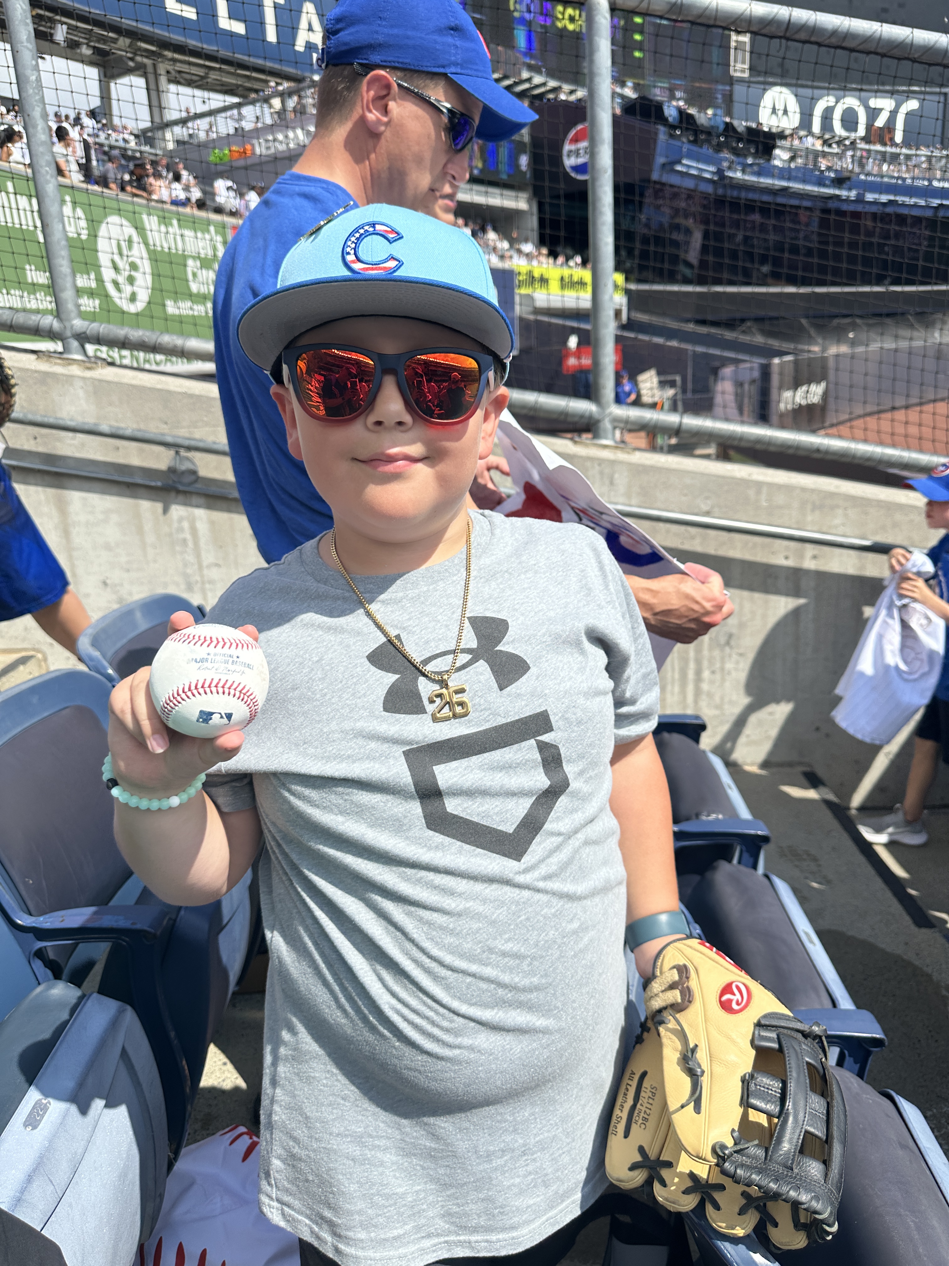 Let me tell you: no matter where we go, wearing a Cubs hat is like a friendly confines sign to passersby who yell, “Go Cubs!” and offer a thumbs up or high five. Cubs fans are everywhere. We found our seats in the outfield surrounded by a sea of Cubs fans with a few Yankees fans sprinkled among them. There was a happy young man who kept chanting to our favorite left fielder, “I love you, Ian!” Our seats were cushioned but toasty hot in the sun. Luckily, we had access to the Pepsi Lounge where we could spend $60 on three drinks in air conditioning – worth it! Out in the heat, our seats were right next to the visitors’ bullpen where our team warmed up the pitchers. Our All-Star pitcher Boyd held off the Yankees for eight innings with no runs. In the end, our relief pitchers allowed a few runs, but the Cubs beat the Yankees 5-2. And they went on to win the series 2-1.